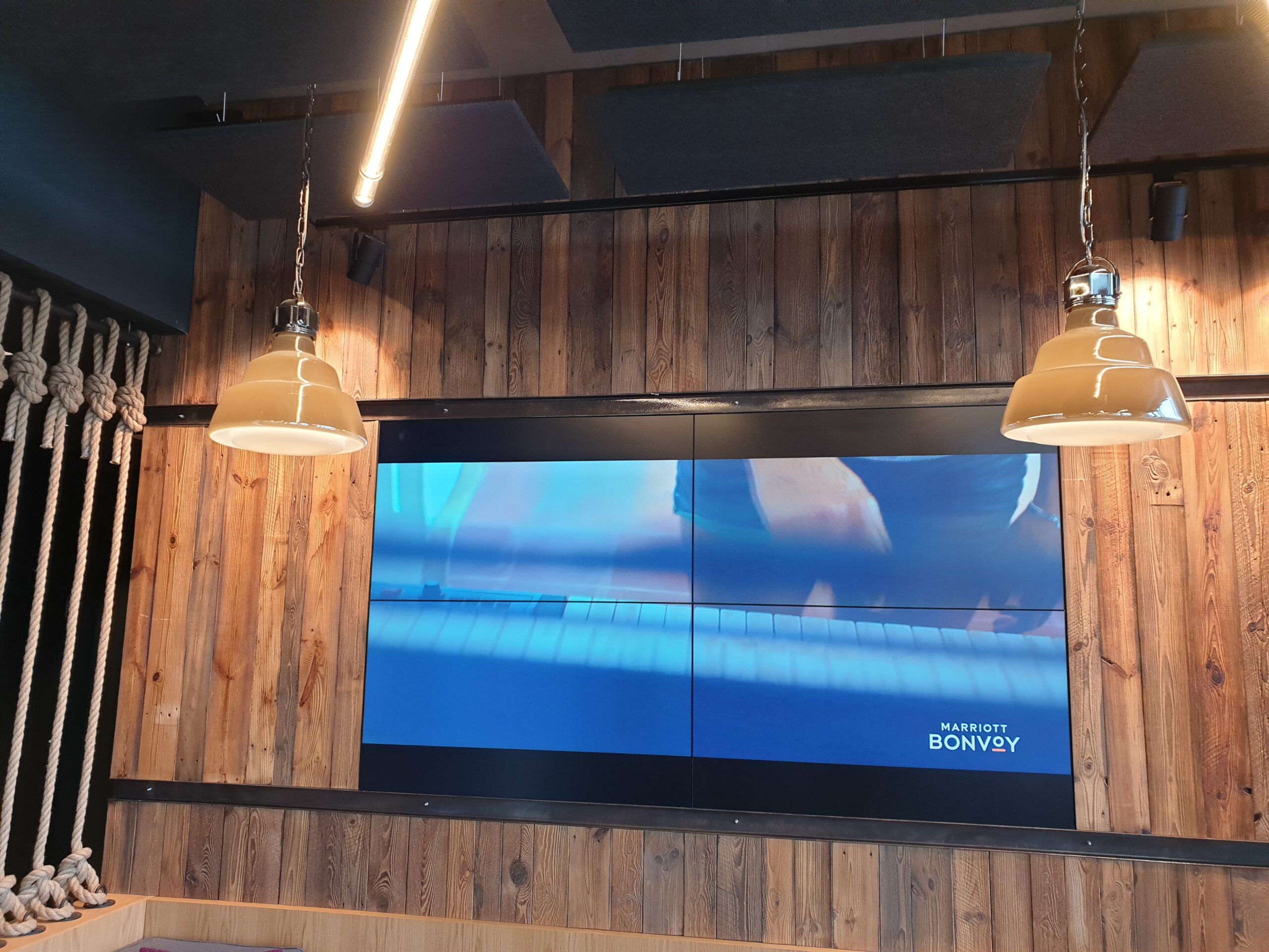 System telewizji hotelowej Samsung Reach, dystrybucja sygnału IP TV, wdrożenie centrali telefonicznej, nagłośnienie części wspólnych hotelu, wyposażenie sal konferencyjnych, ściana wideo w holu głównym.